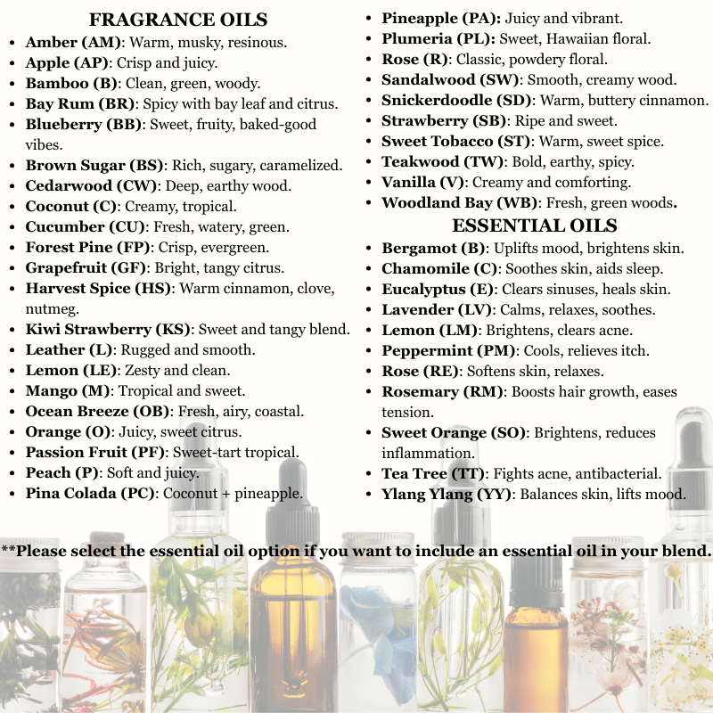 Select up to three fragrance oils from our curated list to create your personalized ONE OF ONE blend. Give your creation a custom name—your blend may be featured on our socials!